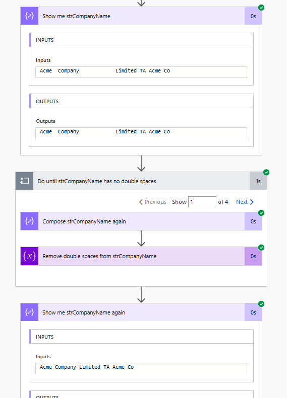You might wonder why this is in a loop. If the Company Name string contains multiple continuous spaces, you will need a few iterations of this to get them all: