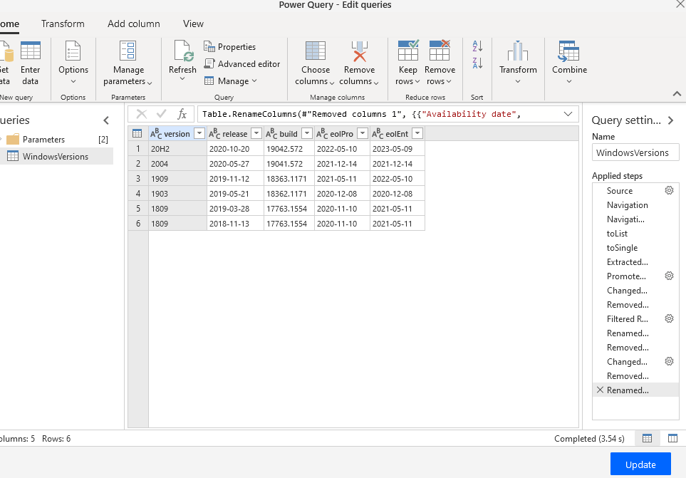 It used to be easy enough to web scrape some tables from the Microsoft website, but no longer. To navigate this challenge I’ve ended up publishing a list I’ve called the WinVerProject which uses Power automate, Azure SQL and GitHub (because it’s free!) to automatically build and publish a list that you can use in your own Power BI reports.