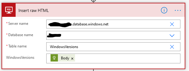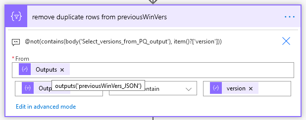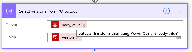 Now I create a one-dimensional array of the Windows version numbers from the Power Query output using the Select action: