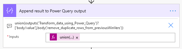 Now append the result to the Power Query output using the union() function: