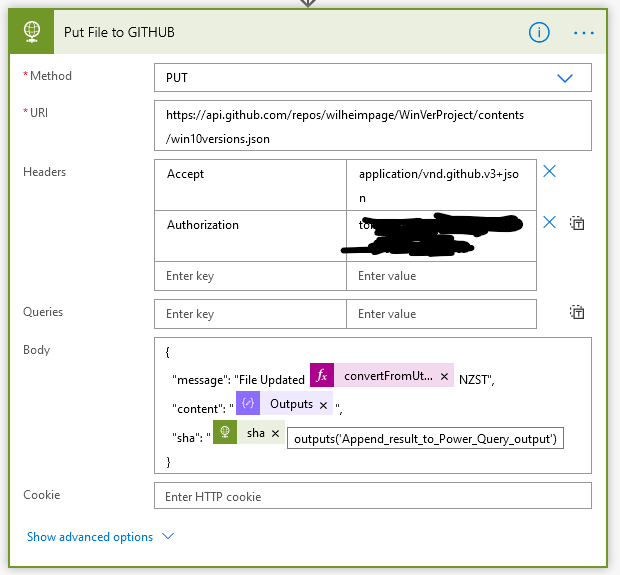 To update an existing file in GitHub using the API you first have to do a GET, then use the sha attribute in the PUT. We already retrieved the file content from GitHub to use as a basis for the new table, so that data is already available to use in the next request body.