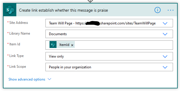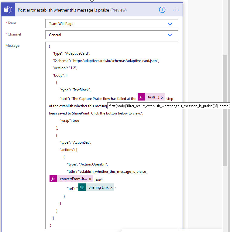 Next up, post an error message to a Teams channel. This way your whole team can see it and you can discuss who is going to action it. I much prefer this to email. This adaptive card contains a link to the error message from the failed action, and some detail: The name of the flow that failed, the scope that failed, and via the highlighted expression, the name of the actual action that failed. You could also include the error message here too, but they’re often quite verbose so I prefer to leave it to the person to open the file to see that.