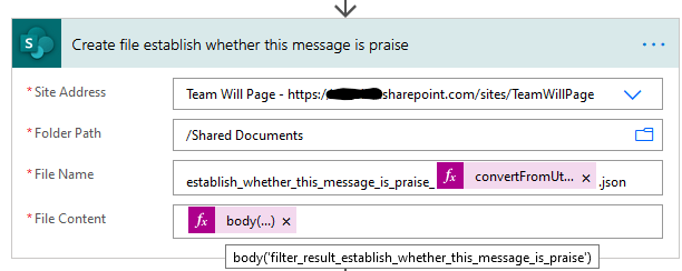 Now create a file in SharePoint. Note the scope name in the file name. I also add a timestamp to avoid file naming conflicts. The content is the output of the filter array: