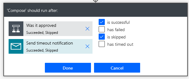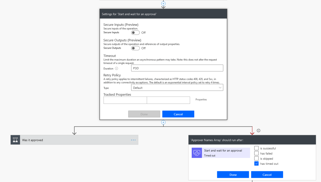 In this screen shot you can see the settings for “Start and wait for an approval” has a timeout duration of 3 days, and a branching condition underneath that runs when it has timed out – a catch: