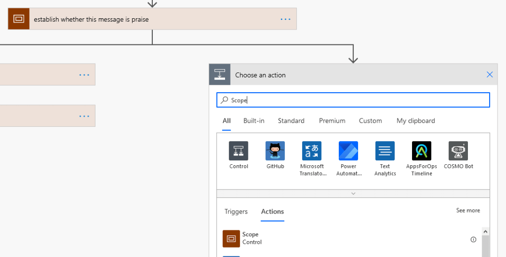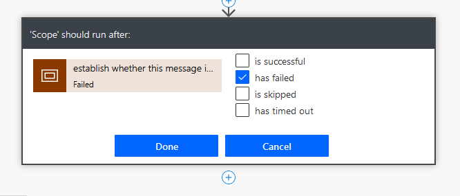 Scopes are great for error handling. A scope is a collection of actions. The presence of a scope doesn’t change the way a flow runs, but it does make it easier to read, and the output status of a scope reflects the output status of the last executed action within it.