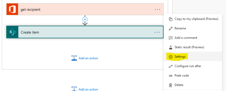 The first two are at the action level – that is to say they are properties of individual actions that you can access by clicking the ellipses and going into Settings: