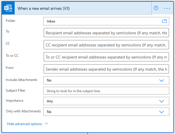 Create a new flow. The trigger is When a new email arrives (V3). Everything you can see here is left on the defaults