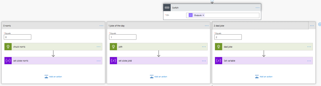 In each case, make an http request to a free joke API. 0 = chuck norris, 1 = joke of the day and 2 = dad joke.