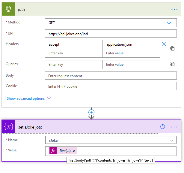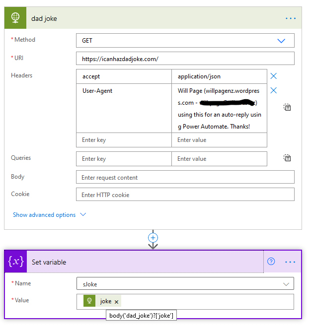 Each of these Set variable actions look like dynamic content from the preceding action, but actually they’re not. I typed these into the expression editor based on the response schema in the documentation and Power Automate then prevents you from editing the expression after you’ve saved the flow.
