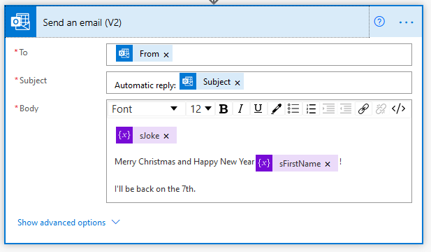 You can simplify this by only using one API instead of 3. You can simplify it by not bothering to parse the From name from the email, or you could expand it by having different responses depending on who the sender is by switching on the domain suffix. You could even add cognitive services to get the sentiment of the sender’s email and customise your response accordingly. The world’s your pavlova with Power Automate and Azure technologies.