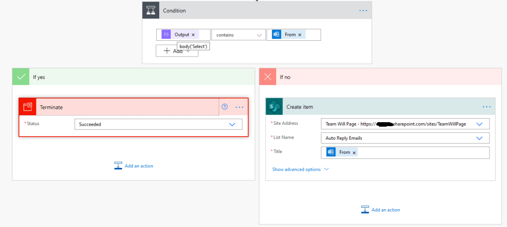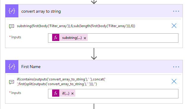 The first action is really two in one. First(body(‘Filter_array’)) effectively turns this one item array into a string. Substring() is used to pick out the bit that starts after From: by ignoring the first 6 characters. Substring has 3 inputs; The original string, the starting index (in this case, 6 chars in) and the length, which in this case is the length of the original string minus 6. We have to use the original string twice in this expression so we turn the single item array into a string twice. This could really be done in two actions.