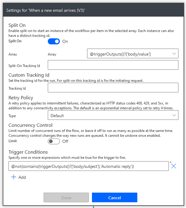 You don’t want to trigger on automatic replies, so we set up a trigger condition. Go into the settings of the action: