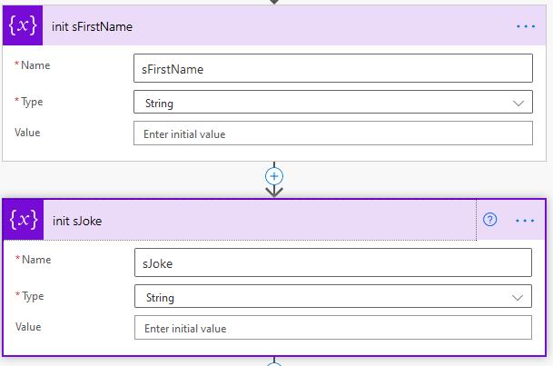 Now we know we’re going to do the thing, initialise a couple of variables. One of the joke and one for the first name of the sender. Both of these are optional really, but I have some branching and error handling that means I need these.