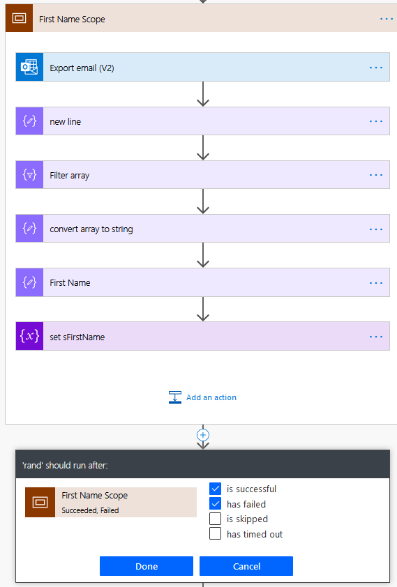 These actions will grab that name if it exists. I put a bit of effort into making sure it never fails, even if there’s no from name but it still might. I’m going to be on holiday and I don’t really want to debug this so I put all the actions in a scope, and set the next action after the scope to run even if the scope fails. That’s also why I use the variable to hold the name.