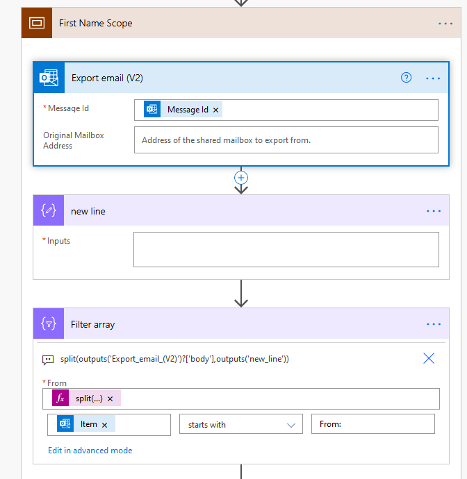 The first action, Export message, is pretty straightforward. Next, Compose and put a new line in there. Next, Filter array: