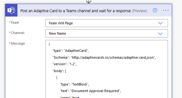 Use the action called “Post an Adaptive Card to a Teams channel and wait for a response”. In this case the team only has members who are authorised to approve documents. You therefore don’t need to hard-code names into the flow. If you’re a member of the group you can participate in the approval process. This is like the “First to respond” option in the native approvals.