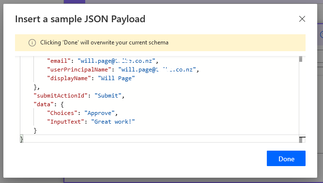 Now, because the output of the adaptive card is dynamic based on the schema of the card itself, you don’t get nice easy dynamic content.