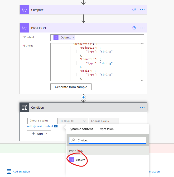 Now I can find “Choices” which is the outcome of the Approve/Reject dropdown as dynamic content: