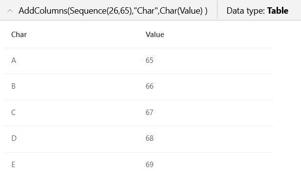 AddColumns(Sequence(26,65),”Char”,Char(Value))