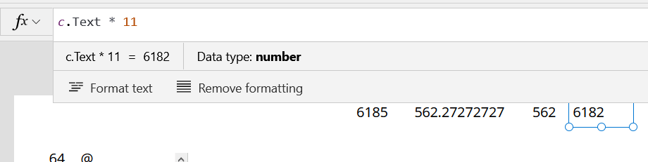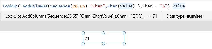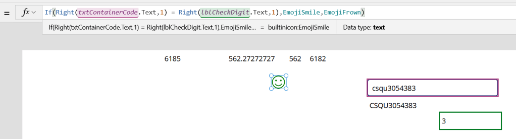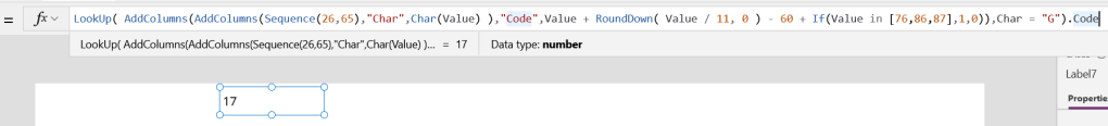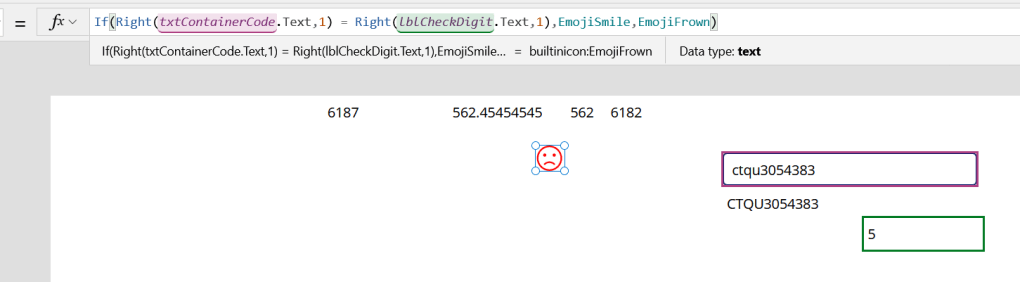 AddColumns(AddColumns(AddColumns(Sequence(10,0),”Character”,Mid(lblUpperContainerCode.Text,Value+1,1),”Sum1″,2^Value),”Code1″,LookUp(AddColumns(Sequence(26,65),”Char”,Char(Value)) As CharMap,CharMap.Char=Character).Value),”Code2″,If(Value<=3,Code1+RoundDown(Code1/11,0)-60+If(Code1 in [76,86,87],1,0),Value(Character)))