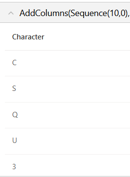 AddColumns(Sequence(10,0),”Character”,Mid(“CSQU3054383”,Value+1,1))