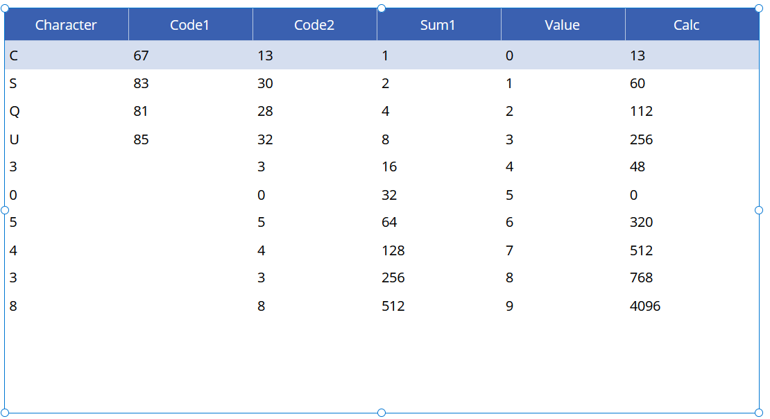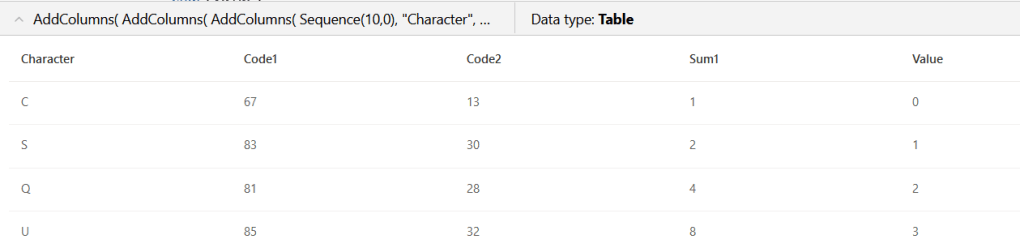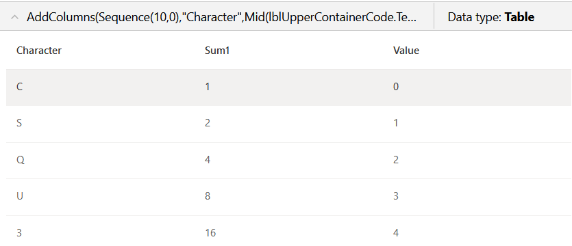 AddColumns(Sequence(10,0),”Character”,Mid(lblUpperContainerCode.Text,Value+1,1),”Sum1″,2^Value)