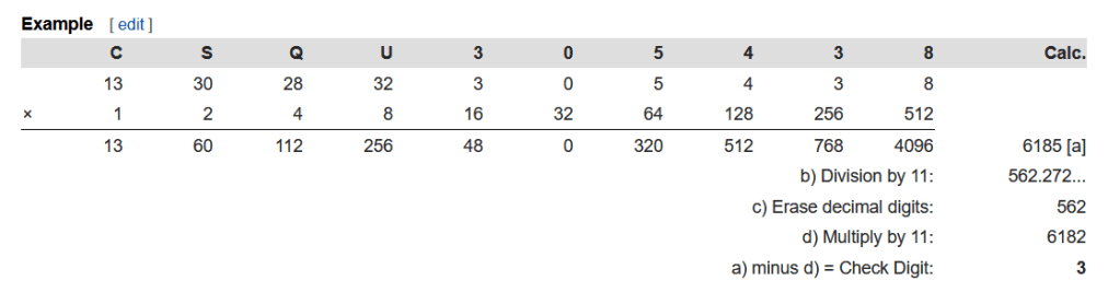 Edit: Since I posted this yesterday, it has been pointed out to me that some container codes don’t calculate properly. I figured the Excel formula I based this on is slightly wrong, and the codes for letters L, V and W are one digit too low. It’s easy enough to adapt the formula for this so I have corrected it with an If() statement that adds one to the code when the character code is 76, 86 or 87. To be honest I’d rather have the mathematical chops to do it properly but the If() will suffice.