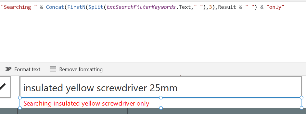 This works by taking a string from the Text Input, splitting on a space character to create an array, then selecting individual items in the array with FirstN() and Last() to feed into the successive Search() functions.