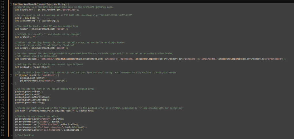 Now let’s look at a pre-req script from a Postman collection. I’m picking the API for a SaaS app called AroFlo, which is ERP for trades companies.