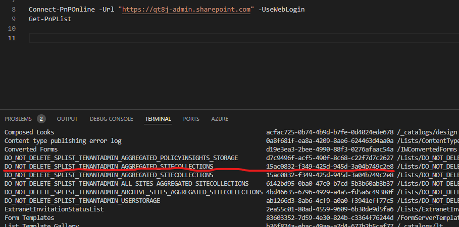 So how do we find the super-secret list? Easy. Let’s just switch to PowerShell quickly. Connect to your admin site and run Get-PnPList: