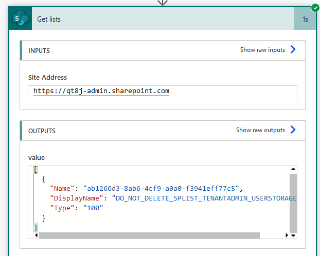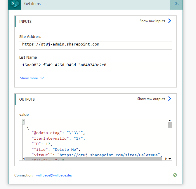 Note the Site Address is the admin site – you’ll need to use a custom value and type that in. In the list of lists you’ll only see that single one from the Get lists screenshot earlier. So again, use a custom value and paste the list ID you got from PowerShell earlier.