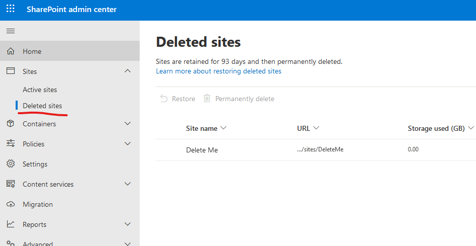 In the SharePoint admin centre you can see a list of deleted sites. It’s easily found: